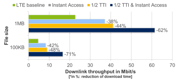 Figure 4 below shows the potential gains in terms of increased download throughput and reduction of download time for the latency reduction techniques of allowing for instant access in the uplink optimizing the latency of the SR procedure, and TTI shortening (to ½) including shortening of the processing delays to half, as well as a combined approach. In the simulation we analyzed download file sizes (e.g. of an HTTP item) of 100 KB and 1MB. With instant access in the uplink (= allowing the UE to transmit when it gets data on a pre-established grant) or by reducing the TTI and processing times to 1/2ms the download performance can be improved significantly, i.e. the maximum LTE link throughput of 150Mbit/s as assumed in this example can be utilized more effectively
