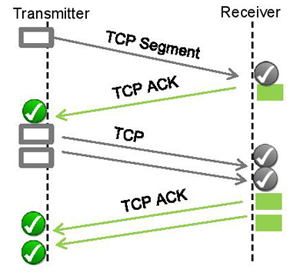 Figure 2. The initial TCP slow start phase; the ramp up of number of bytes sent (=number of TCP segments sent) is depending on the round trip delay until the transmitter gets the acknowledgments (TCP ACKs) for the transmitted bytes.