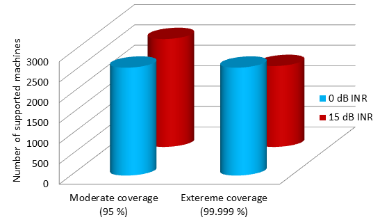 Then to the second essential question: “What would be the practical limits of a mission-critical MTC system for a typical application?” To answer this, we have modeled a simulation scenario based on a factory floor layout with the dimensions 100 m x 100 m. We assume that the industrial application requirement dictates only one message in one billion data transfers may be lost or delayed within a 100 µs air interface delay. The simulation results, depicted below, show that the mission-critical MTC system, with aforementioned enablers, is able to support thousands of industrial automation machines spread out in a factory floor (e.g., for uplink data transmissions). We also found that the increased diversity improves the robustness of the system against unexpected or unmitigated interference sources. This is also shown in the figure below, by the interference-plus-noise ratio (INR) metric which refers to the relative interference-to-noise power in the channel. Therefore, we highlight the diversity as an essential tool for the availability and reliability in mission-critical radio access.