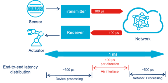 Figure 1: Latency distribution based on Tactile Internet ITU-T Watch report numbers. 100 µs can be assumed as the air interface delay per direction.