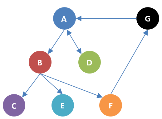 Figure 2: Example brokering PKI. Circles are single identities. Arrows indicate that a node has a link to another node, and a double directional arrow indicates that both nodes have links to each other.