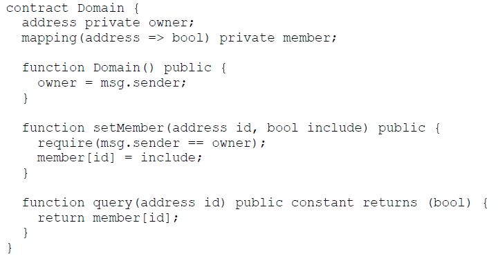 Example of a rudimentary domain concept implemented in Solidity. The owner (creator) of the domain can add and remove members with the setMember function. With the query function it is then possible to check if an address is a member or not.