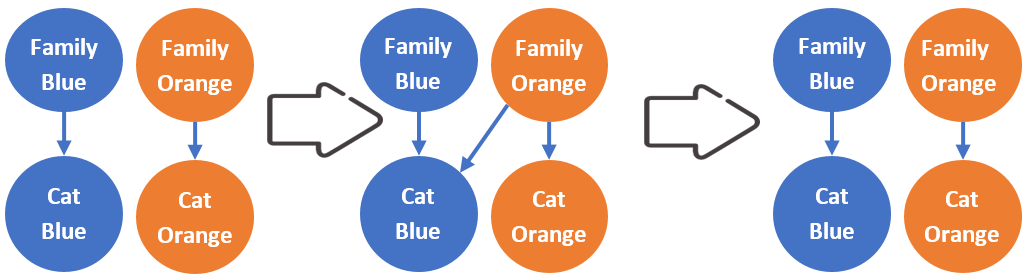 Two neighboring families have houses with smart cat flaps, that is, the cat flaps can identify cats based on RFID chips on the cat collars. Based on the identity, the flap either stays closed or opens to let the cat in. The families – Family Blue and Family Orange, see Figure 1 – each owns one cat, Cat Blue and Cat Orange. As Family Blue is going away on a vacation, Family Orange has agreed to let Cat Blue into their kitchen for cat food and water during the duration of the vacation. To achieve this, Family Orange adds an identity link to Cat Blue in the identity management system. Similarly, when Family Blue comes home from their vacation, Cat Blue can be locked out again from Family Oranges house by removing the identity link to Cat Blue.