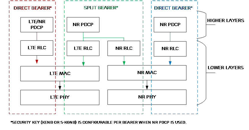 - Direct DRBs: DRBs with only one lower layer configuration, either corresponding to LTE or NR lower layers. If the LTE lower layers are configured, either the NR or the LTE version of the higher layer can be used by the bearer. If the NR lower layers are configured, the NR version of the higher layer will be used.