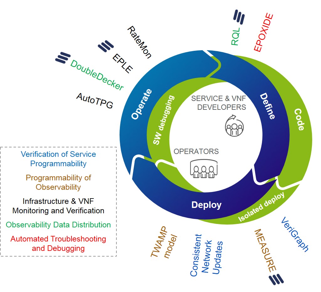 The tools support operators and developers across all stages of the SP-DevOps pipeline, with functionality targeting verification, observability, and troubleshooting (see color-coding in the figure for categories). A set of novel verification tools addresses a key requirement of software-defined infrastructures: the constant verification of service models, both at design time and runtime. The integration with the orchestration ensures that policies can be consistently deployed to the infrastructure and potential deviations are identified at early stages. Furthermore, a software-defined monitoring approach was developed to take advantage of programmable infrastructure platforms for providing key quality indicators such as congestion notifications and packet loss estimates with a fraction of the overhead of typical network management functions. The tools were designed to be integrated in a software-driven lifecycle management and provide data through a scalable, carrier grade messaging system that eases integration. Their APIs were designed to be familiar for both Developer and Operator roles. Finally, a novel way to automate network debugging processes was implemented through a developer-friendly troubleshooting tool.