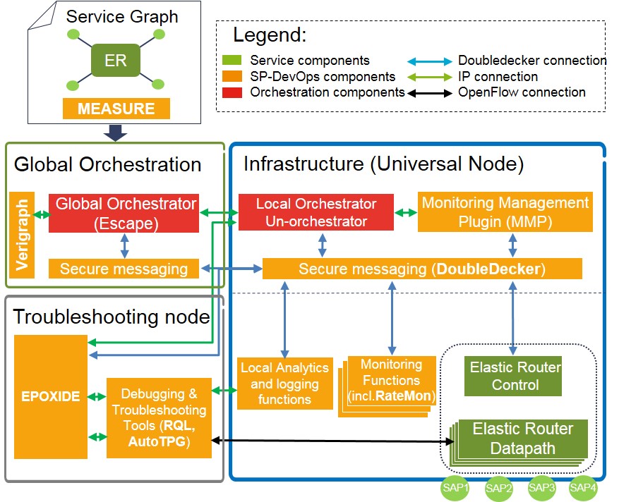 More importantly, we – together with many UNIFY partners – had the ambition to give a more qualitative analysis of our concept in a scenario involving practical network management challenges of the emerging network virtualization era. Consequently, we demonstrated selected SP-DevOps processes integrated with the UNIFY global orchestration platform and the Universal Node, as sketched in the figure below (bold text indicates components part of the public SP-DevOps toolkit). A few key SP-DevOps tools and functions enabled the technical integration with the orchestration and infrastructure layer realization of UNIFY: Our supporting functions for programmability and data distribution (i.e., MEASURE and DoubleDecker) facilitated efficient integration of infrastructure and VNF monitoring functions with entities in all UNIFY layers; the modular design of VeriGraph allowed straight-forward integration of verification features into the global orchestrator; and EPOXIDE proved to be a powerful troubleshooting framework to instrument many types of SP-DevOps monitoring and verification tools as well as third-party debugging tools.