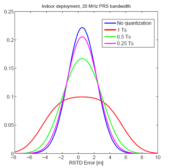 The Release 13 study item also identified limitations due to the OTDOA report resolution, where the Reference Signal Time Difference (RSTD) resolution of 1 Ts (the basic LTE time unit, which is approximately equal to 32 ns) is concluded to be more limiting than the measurement accuracy. Figure 2 illustrates how the combined RSTD error (measurement error and quantization error) vary with the report resolution in comparison to an ideal non-quantized report. Clearly, there is a significant error contribution from the 1 Ts report resolution, and therefore the report resolution was changed to 0.5 Ts in Release 14. Further details about the time of arrival estimation and impact from the report resolution can be found in our PIMRC 2016 paper. For example, in a scenario with an indoor deployment of small cells, the horizontal 80-percentile positioning accuracy improves from about 4m to 2.5m by the improved RSTD resolution.