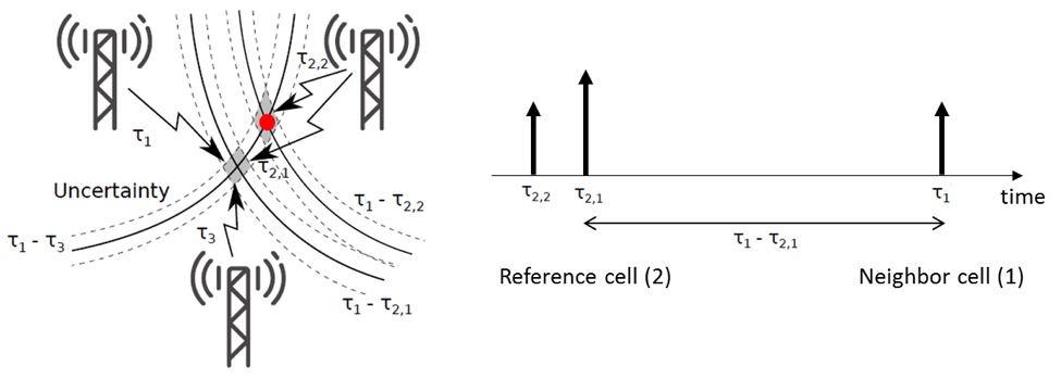 The most significant positioning error component in macro deployments is due to the multipath propagation, where the device does not select a line of sight (LoS) path among the received paths. The reason for not selecting the LoS path is when a different path is erroneously believed to be the most reliable one. Release 14 introduced more rich reporting of measurements, where capable devices will include timing of up to two additional paths per PRS. This increases the probability that the LoS path will be included. In the scenario depicted in Figure 3, the device reports an additional path for the reference cell that corresponds to the LoS path, which enables the location server to estimate the true position. In the studied 3GPP scenario based on an outdoor macro deployment, the horizontal 80-percentile positioning accuracy improves from 40m to 20m when introducing reporting of additional paths.