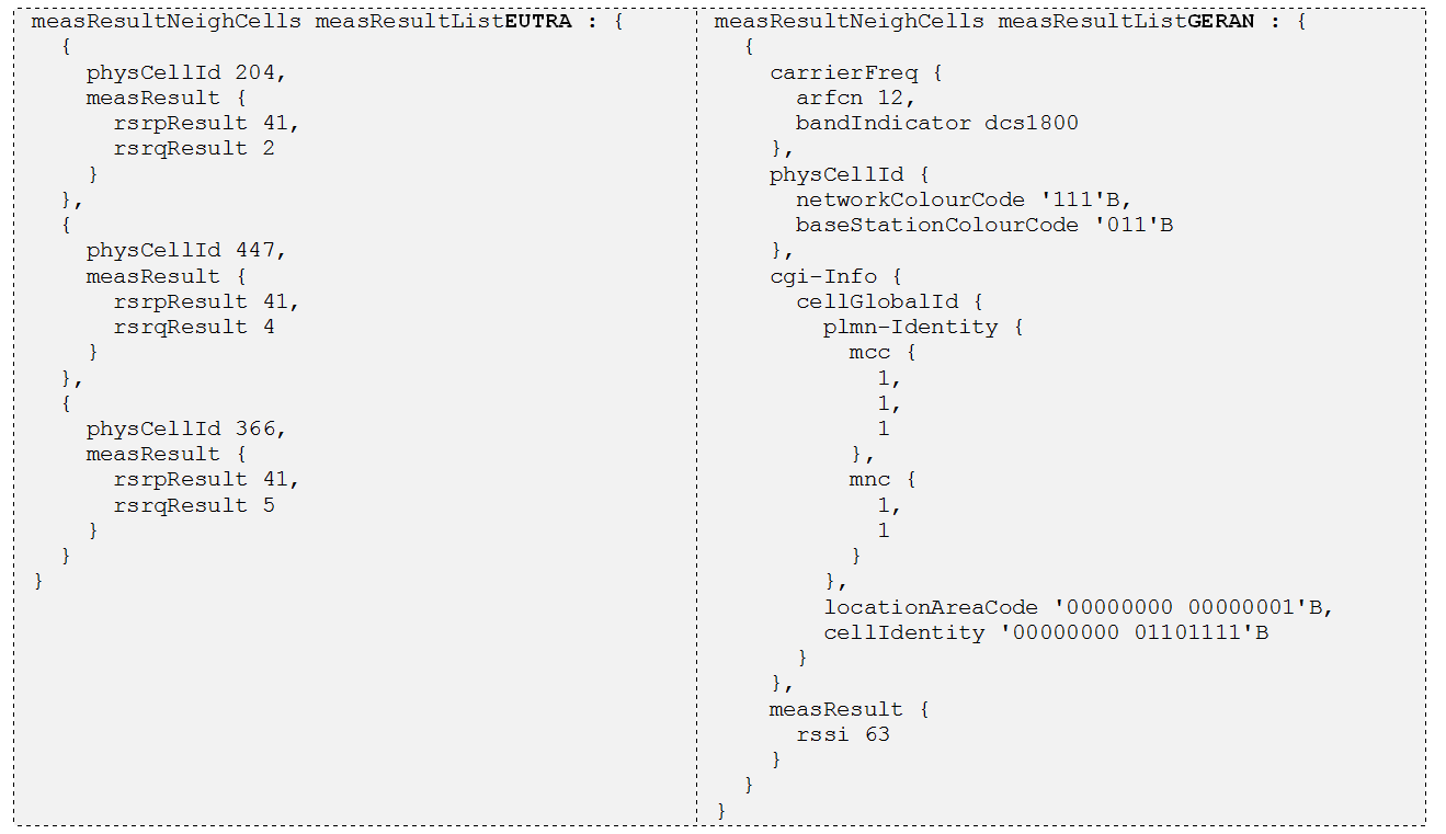 In our experiments we used measurement configuration and measurement reporting procedures in 4G radio resource control (RRC) protocol. Figure 4 shows – in a human-readable form –selected parts of measurement reports for the 4G radio access type (EUTRA) and the 2G radio access type (GERAN). Mind that the same device sent measurement reports for both the 4G and 2G radio access types. Interested readers may consult 3GPP TS 36.331 for further technical details, see for example clause 5.5 on Measurements and clause 6.3.5 on Measurement information elements.