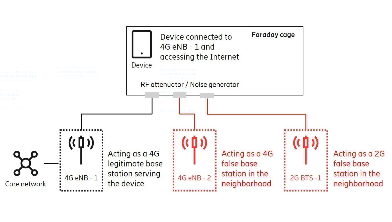 The setup, shown in Figure 3, uses base stations of two network generations, 2G base stations called BTS, and 4G base stations called eNB. The purpose is to verify that a 4G network can be used to detect both 4G and 2G false base stations.