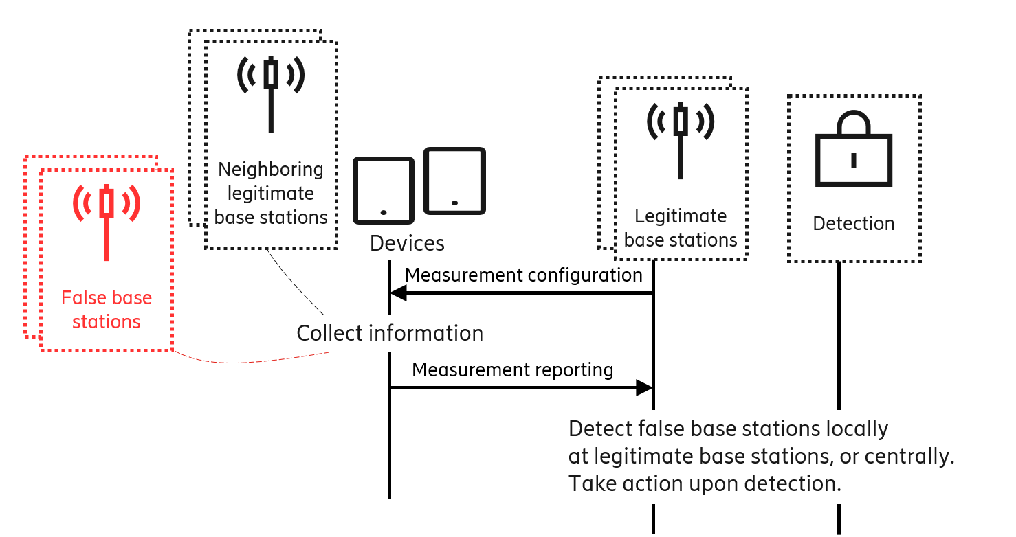 The framework also exploits the fact that devices can report measurements related to many radio access types. That is, a device could be configured, for example, to report measurements of 2G networks to a 5G network of the same operator. The operator can then implement the framework in the newer generation network and enable it for devices also supporting 2G. Doing so allows detection of 2G false base stations without upgrading the 2G network.
