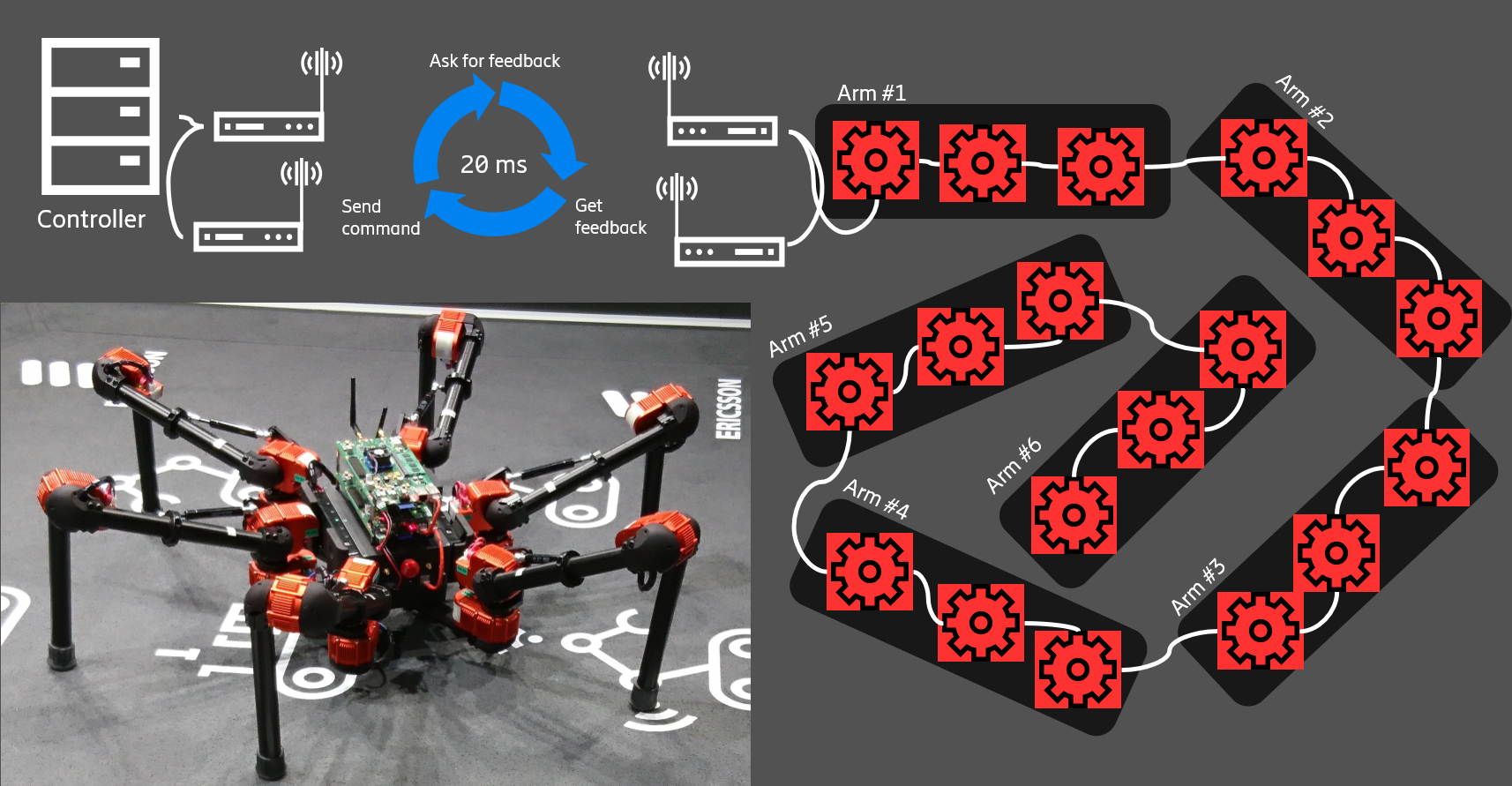 This gives a latency of below 5 ms roundtrip, with a sufficient high reliability. As I already mentioned, the hexapod is made of individual servos – 18 in total – each individually controlled with a 20 ms control loop. (See the illustration below to learn more). The servos are daisy-chained and each one is run by its own 20 ms loop. A stable walk (or dance) is possible through coordinated control of each servo individually.