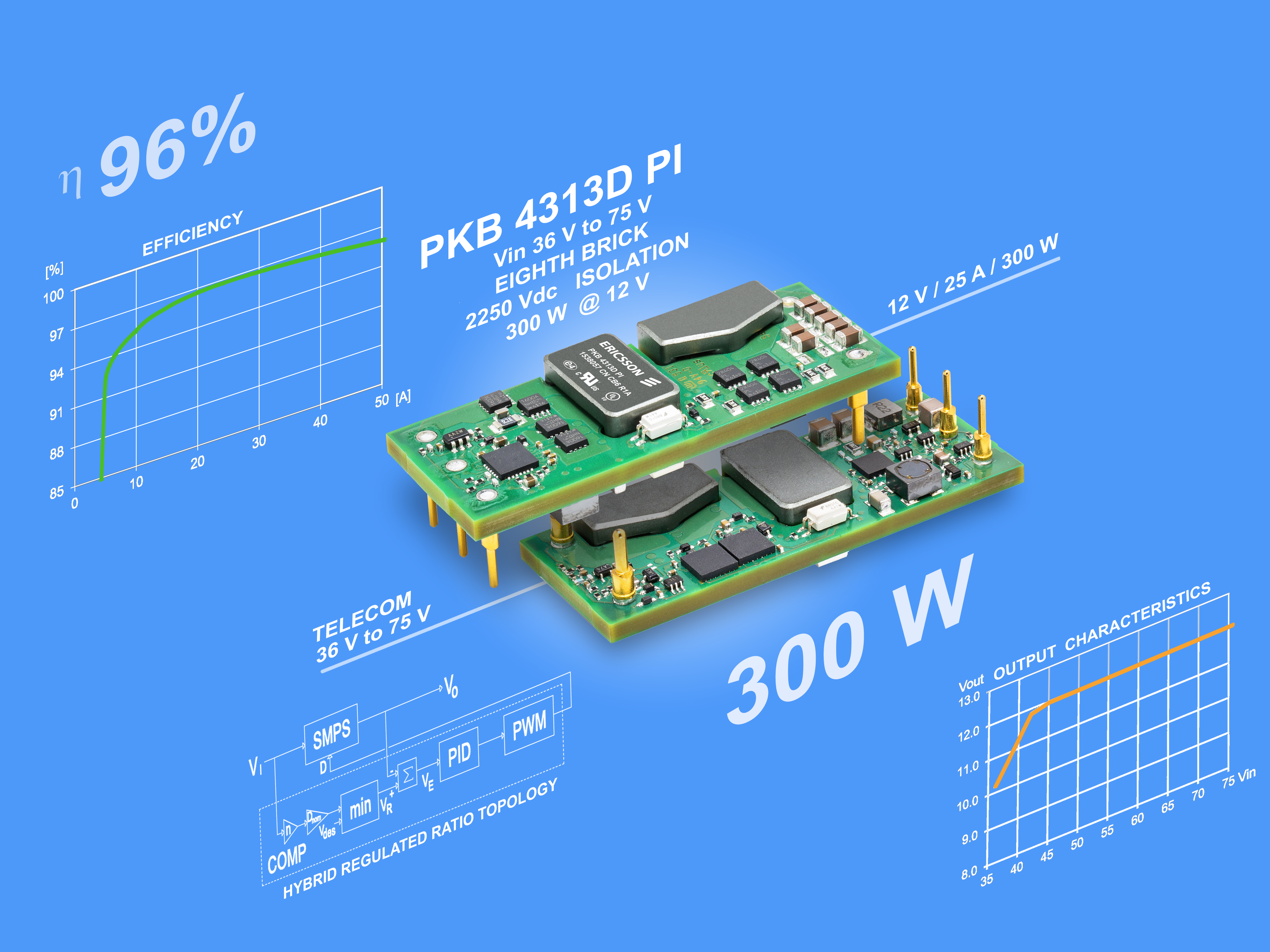 Martin Hägerdal, President, Ericsson Power Modules, says: “The new PKB4313D is the first in a new series of high-power advanced intermediate bus converters from Ericsson. The module combines the company’s innovative HRR topology, which has been further enhanced for this new series, together with world-class power efficiency, tightly regulated voltage capabilities and best-in-class thermal handling characteristics. Overall, the new product offers a compelling package that delivers significant competitive advantage to customers operating at the cutting edge in a range of telecom, networking and industrial applications.”