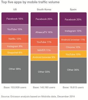 Findings in the Ericsson Mobility Report Mobile World Congress edition, February 2015 reveal the top five apps in a given country dominate in terms of mobile traffic generated on smart devices. In the countries illustrated in the report - the US, South Korea, and Spain - they account for around two-thirds of app traffic over mobile networks, which reflects a global trend.
