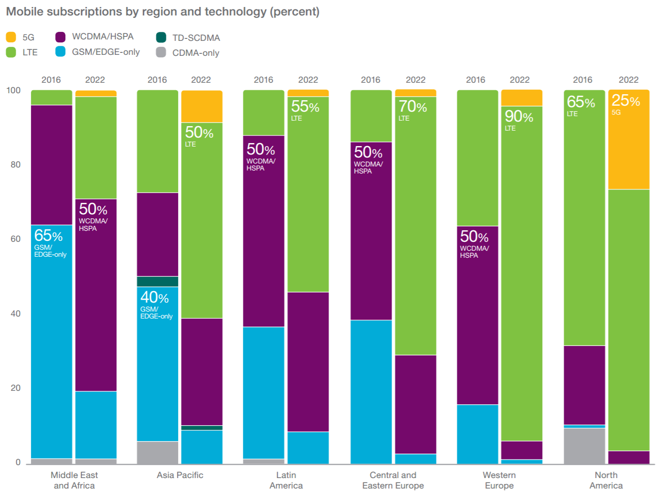 - 25 percent of all subscriptions will be 5G in North America in 2022, representing the highest market penetration in the world