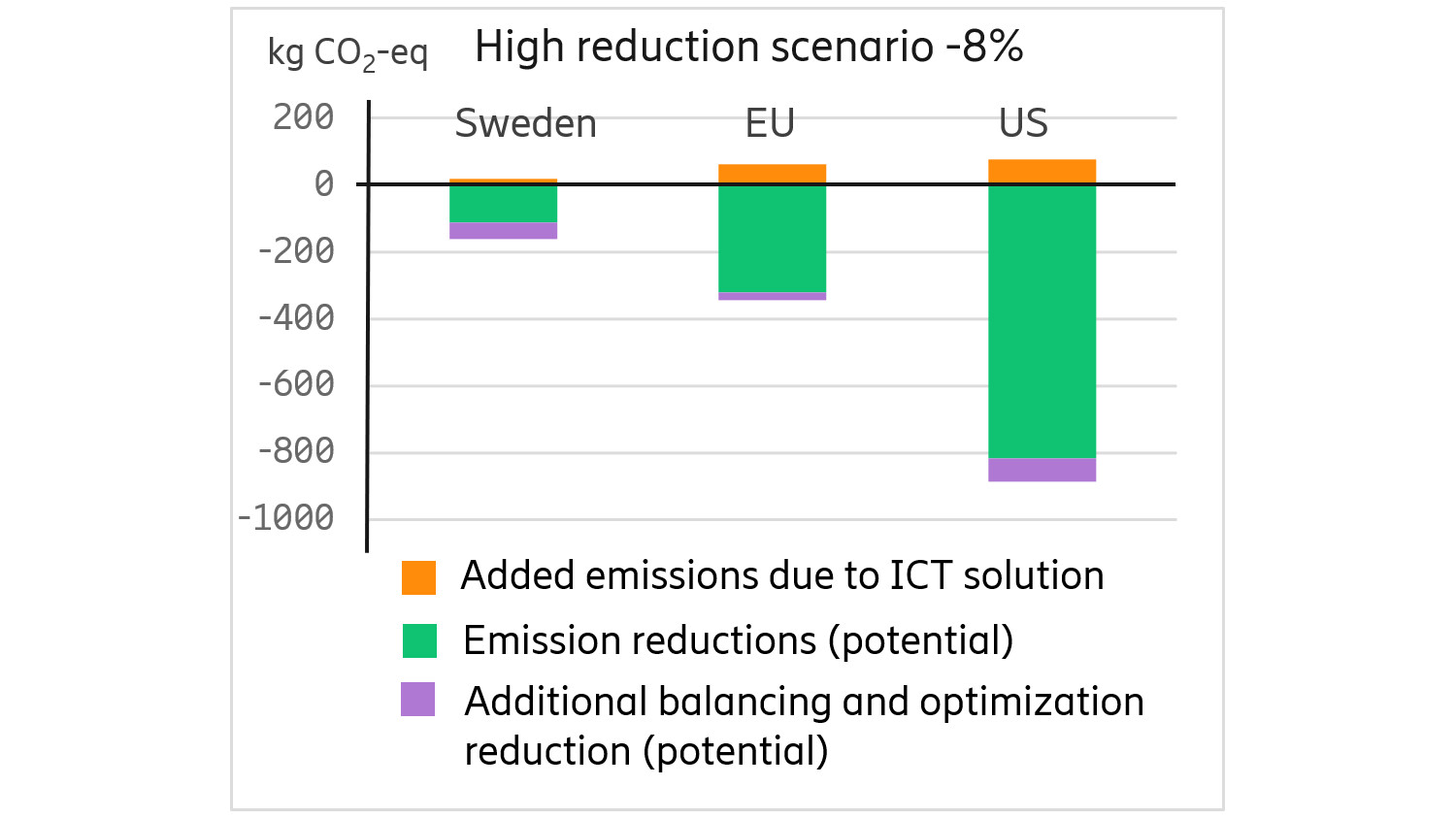 Three different scenarios of reducing the average electricity consumption in households due to ICT solutions for both smart metering and thermostat monitoring/control systems were created, based on the reviewed case studies. The intention is to show ICT’s impact together with the assessed reductions while framing the large variations in the carbon intensity of the grid between countries.