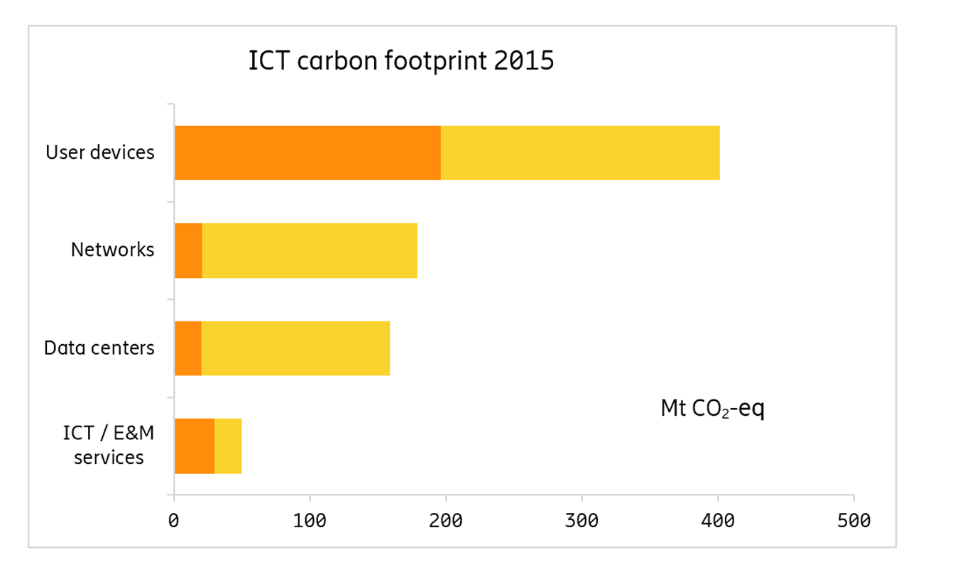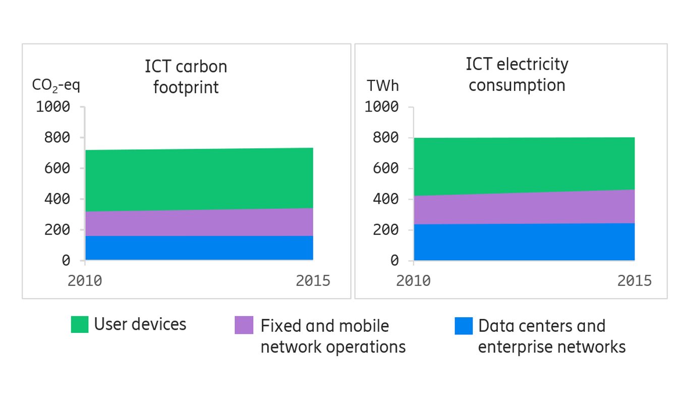 Based on a very large and comprehensive data set, including sales volumes, life cycle assessments and measured energy consumption from network operators, the ICT sector’s carbon footprint in 2015 was about 730 Mt CO2-equivalents (CO2-eq). This corresponds to ~1.4% of the global carbon footprint.