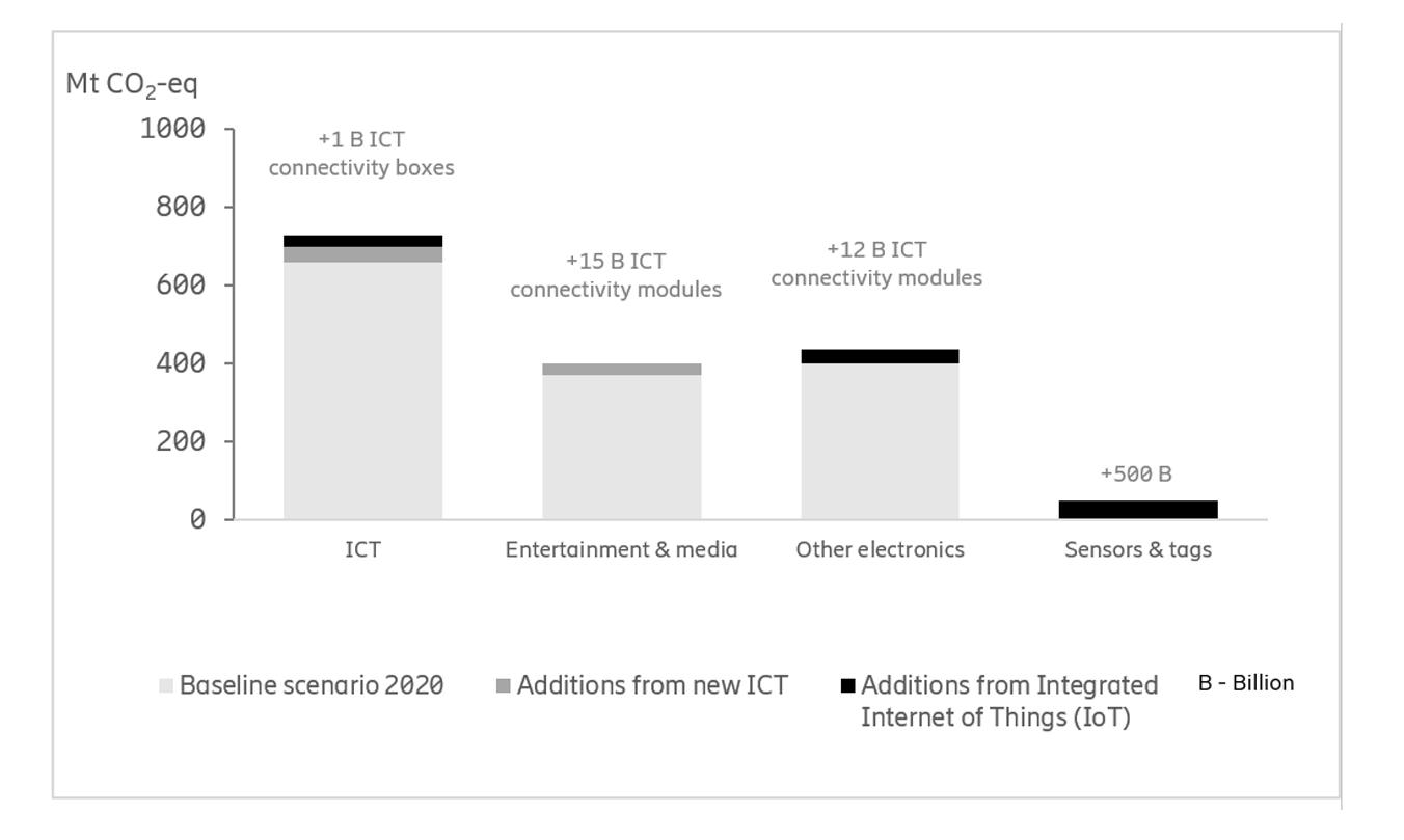 However, a future scenario for 2020 with a massive use of new and integrated devices related to IoT indicates only a small increase in the total carbon footprint of ICT and E&M. This scenario includes life cycle emissions associated with one billion ICT connectivity boxes in ICT, 15 billion ICT connectivity modules in E&M and 12 billion in other electronics, as well as 500 billion sensors and tags.