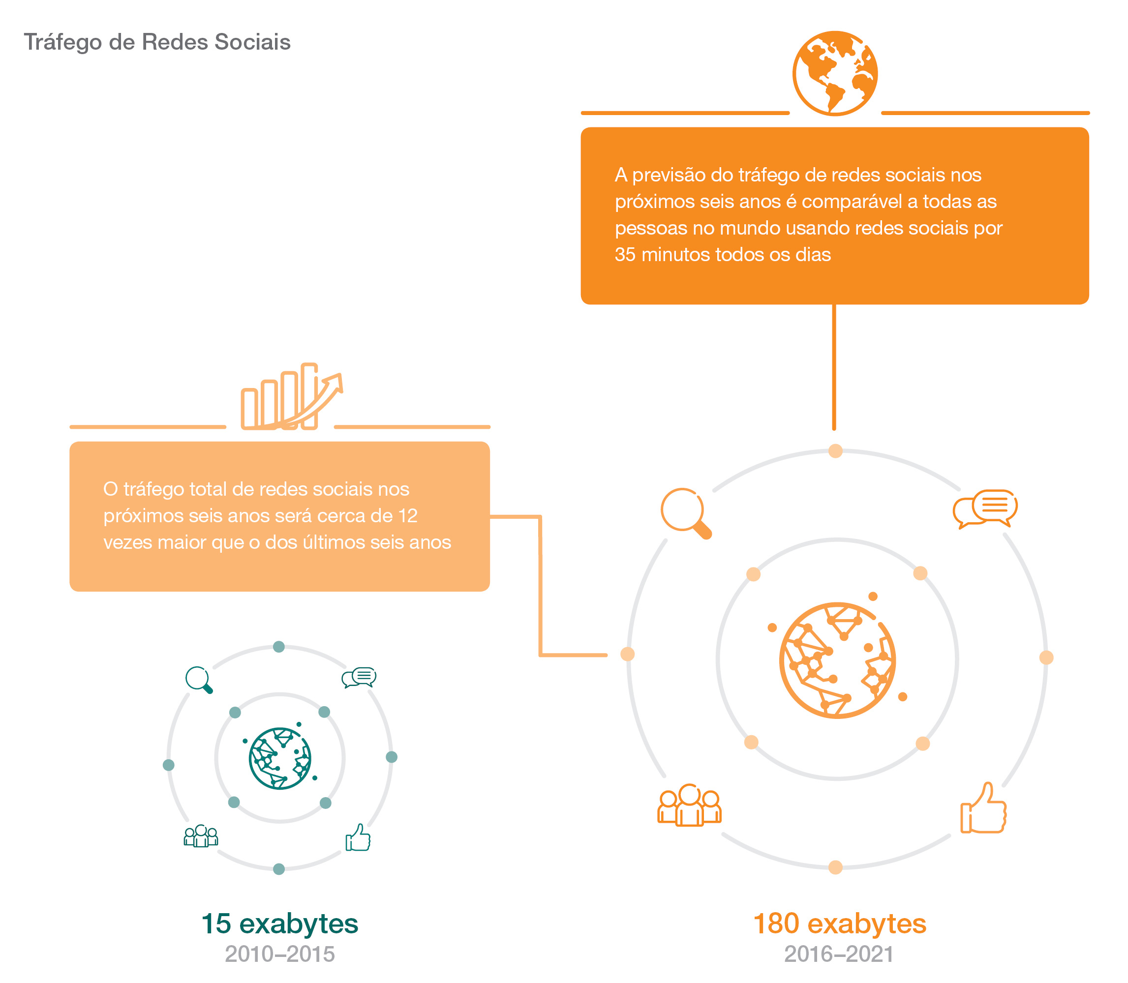 - Estudo também prevê aumento 12 vezes maior no tráfego de rede social ao longo dos próximos 6 anos em relação aos últimos 6