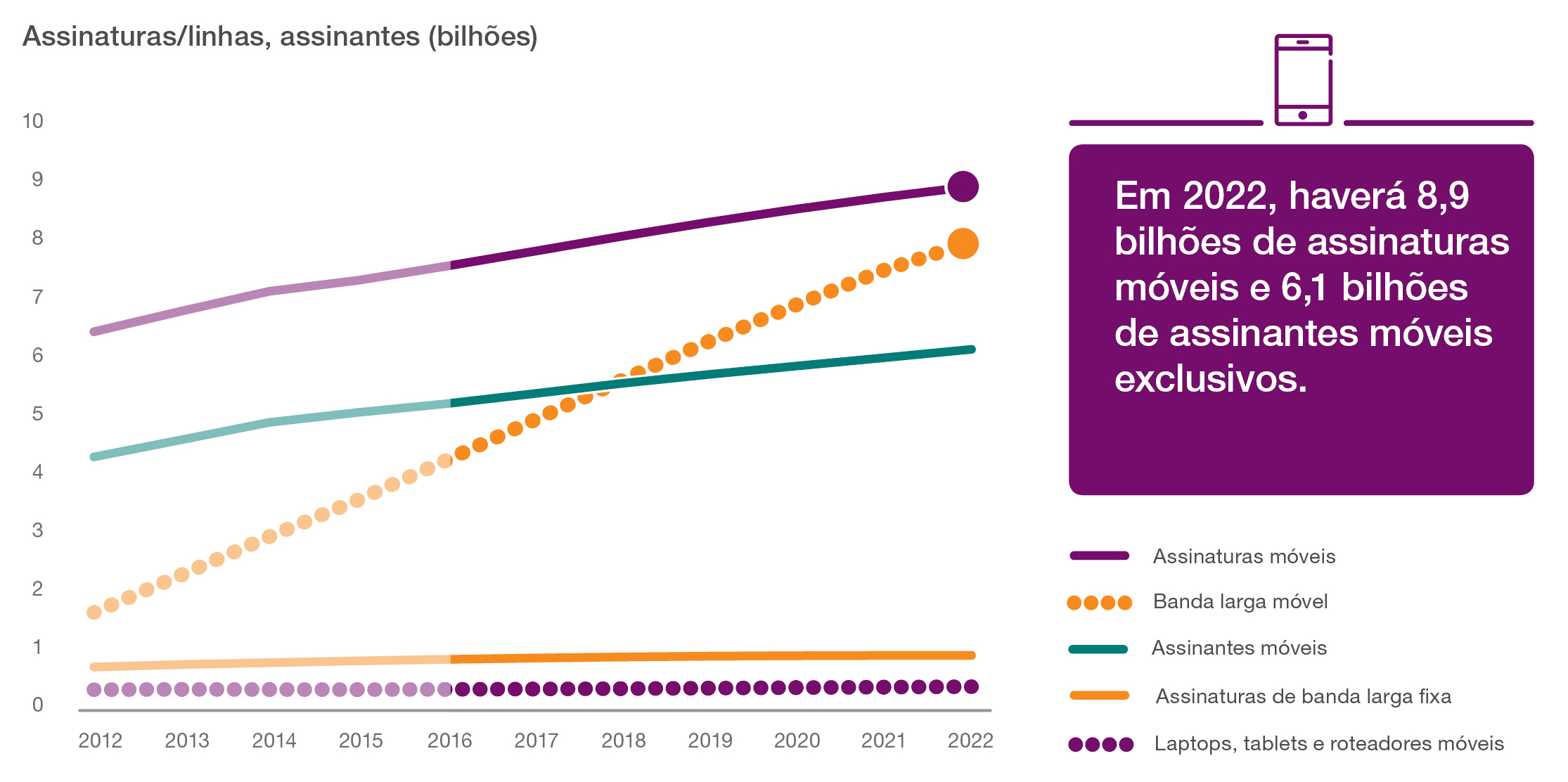 Até o final de 2016, haverá 3,9 bilhões de assinaturas de smartphones. Aproximadamente 90% dessas assinaturas serão registradas nas redes WCDMA/HSPA e LTE. Até 2022, prevê-se que o número de assinaturas de smartphone deve atingir 6,8 bilhões, com mais de 95% das assinaturas registradas em redes WCDMA/HSPA, LTE e 5G.