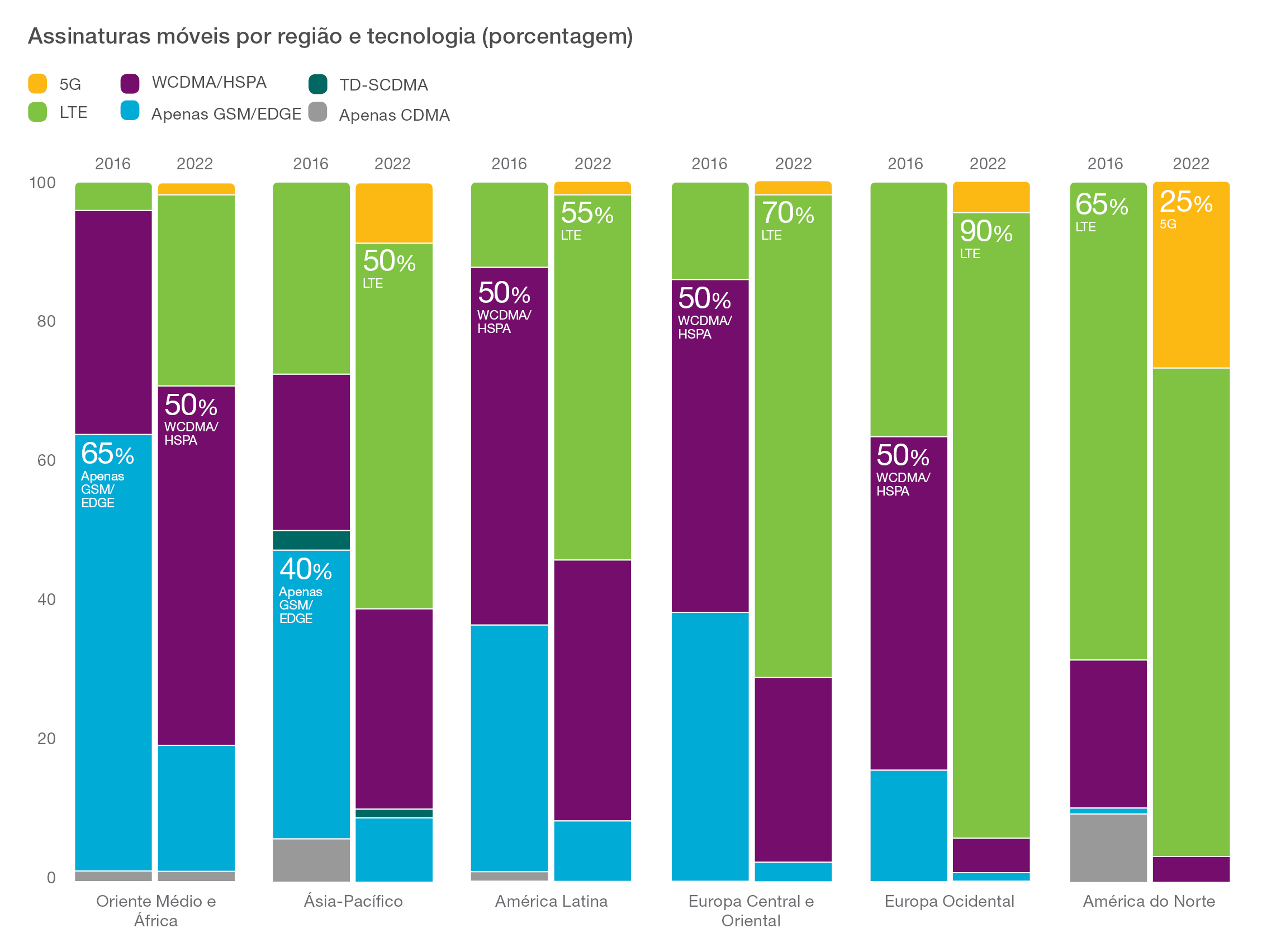 - 25% de todas as assinaturas serão 5G na América do Norte em 2022, representando a maior penetração de mercado do mundo